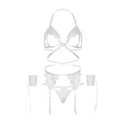 Découvrez l’Ensemble 4 Pièces Ouvert 81653 Dentelle Blanche & Menottes de Leg Avenue ! Une lingerie d’un blanc immaculé composée d’un soutien-gorge, d’un porte-jarretelles, d’un string et d’une paire de menottes !