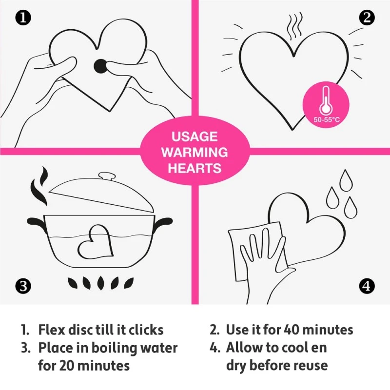 Les CĆurs de Massage Chauffants ont 3 couleurs et motifs diffĂ©rents. Ils sont rĂ©utilisables, il suffit de les plonger dans de l’eau bouillante pendant quelques minutes.