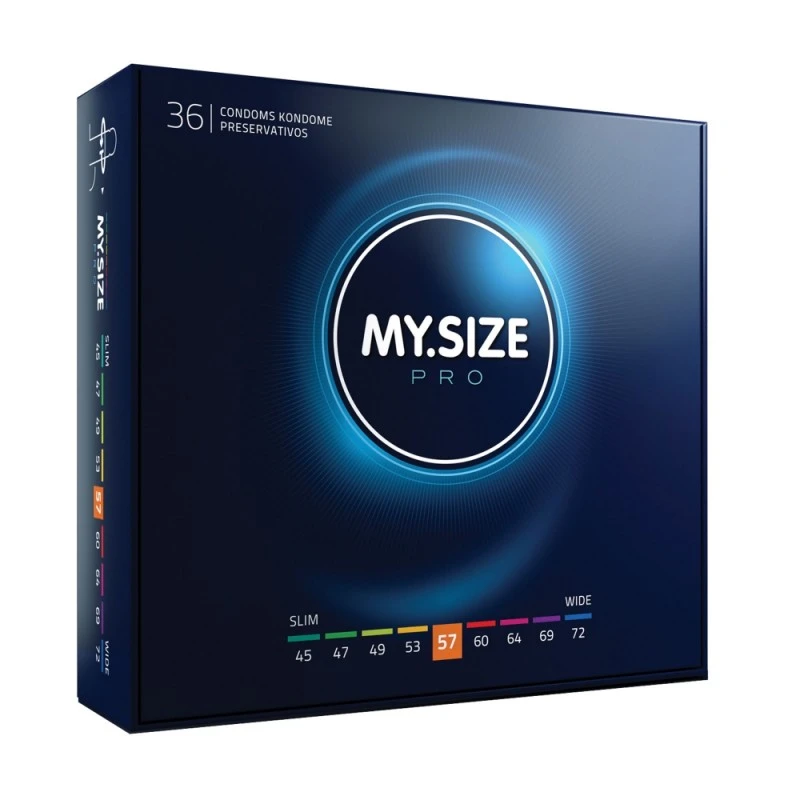 Découvrez la Boîte de 36 Préservatifs MY.SIZE Pro 57 mm, des préservatifs adaptés à votre taille pour vous permettre de profiter de rapports sécuritaires et confortables ! Peu importe votre taille, vous trouverez forcément des préservatifs qui vous conviendront avec MY.SIZE !