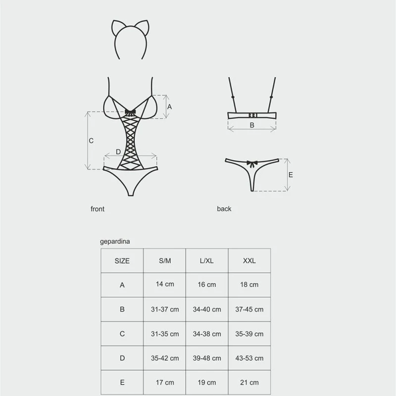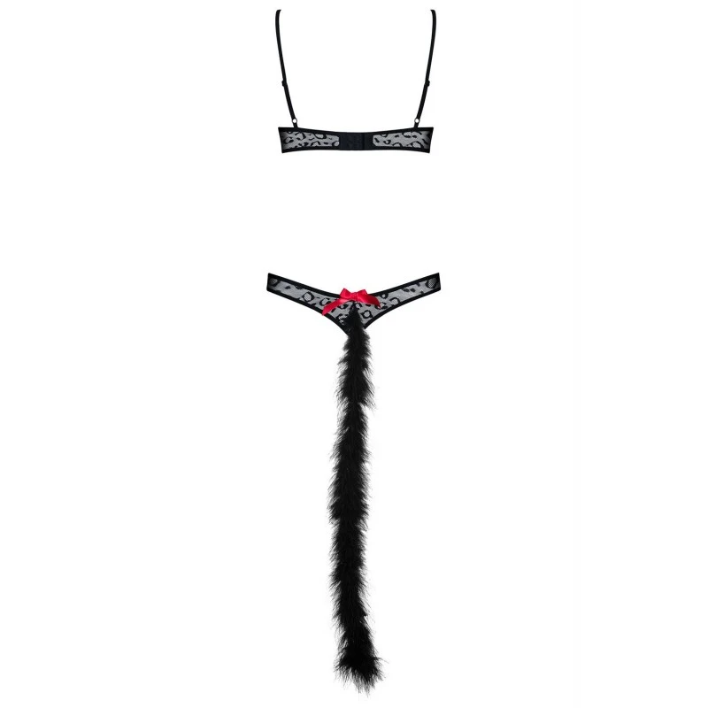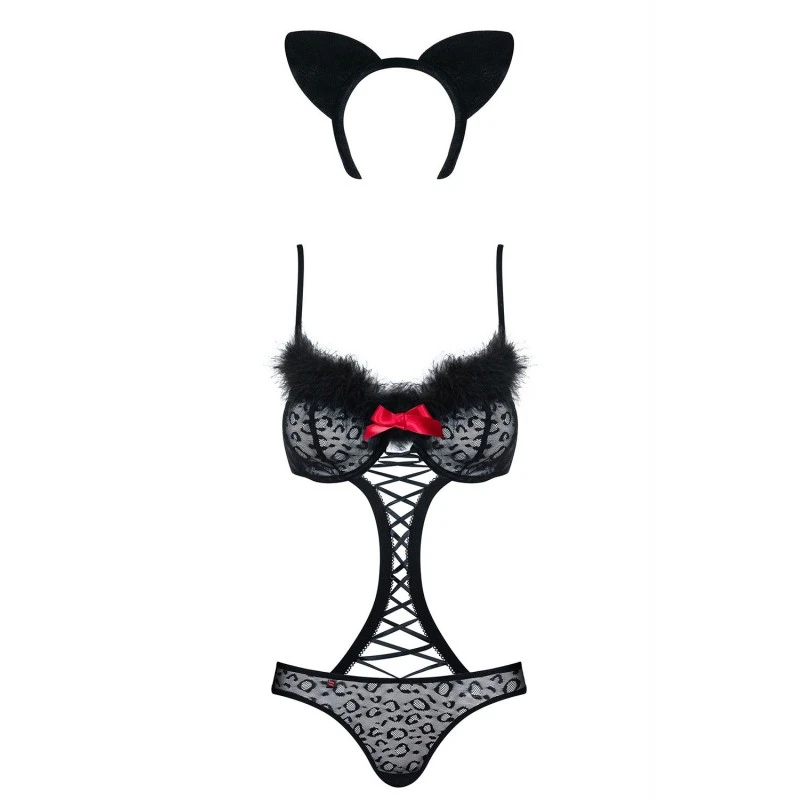 Ce body sexy vous permettra de mettre votre poitrine en valeur grâce à l’armature de son soutien-gorge guépard qui est, de plus, décoré par une fourrure noire douce et agréable à porter et d’un nœud rouge situé au centre. Le string, au motif guépard également, est lié au soutien-gorge par un lacet en satin noir. À l’arrière du string se trouve un petit nœud rouge situé à la base d’une queue de guépard en fourrure noire.