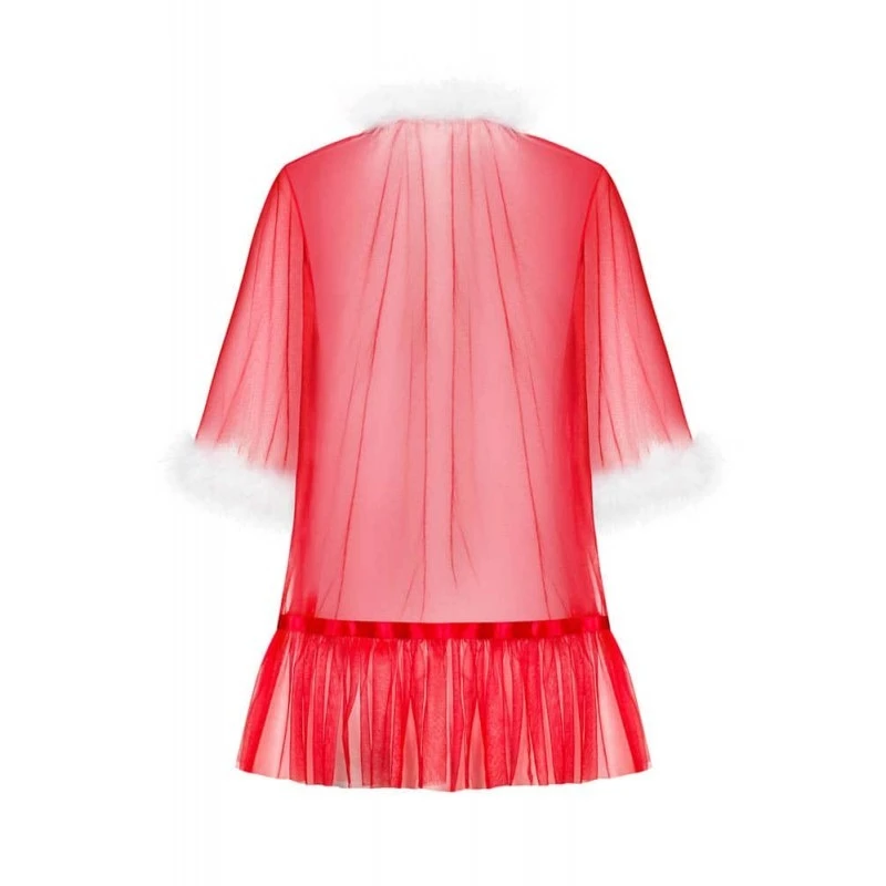 Transparente et rouge, cette tenue a tout pour plaire et elle est composée d’une maille fine. Attachez le déshabillé au niveau de votre cou via un nœud en satin blanc recouvert d’un duvet blanc que vous pourrez également retrouver au niveau des manches.