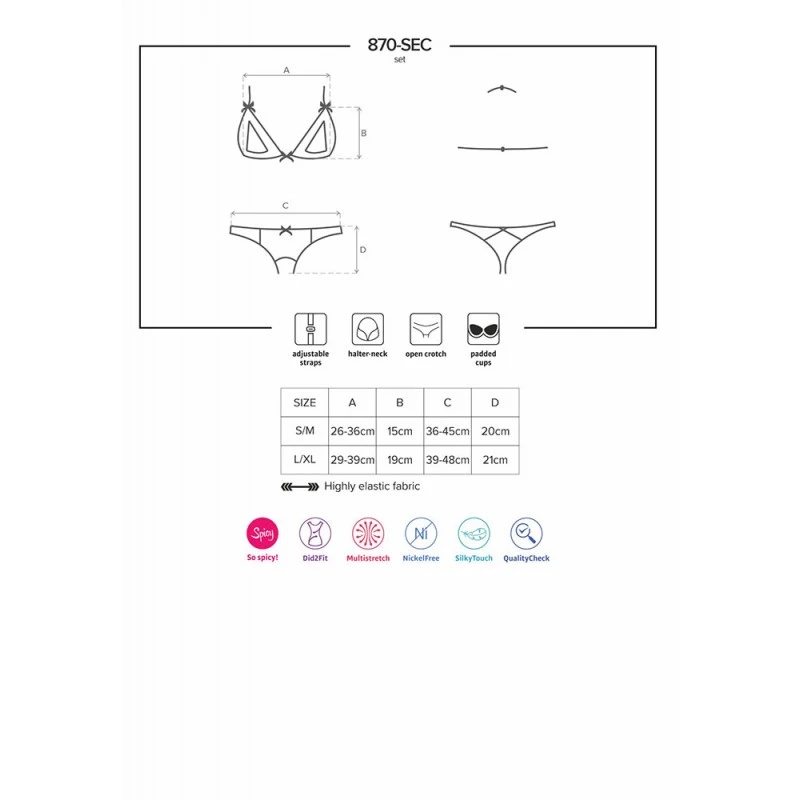 Cet ensemble comprend un soutien-gorge très osé aux bonnets ouverts pour exposer vos seins et rendre votre partenaire fou de désir, et un string ouvert à l’entrejambe pour inviter aux moments coquins…