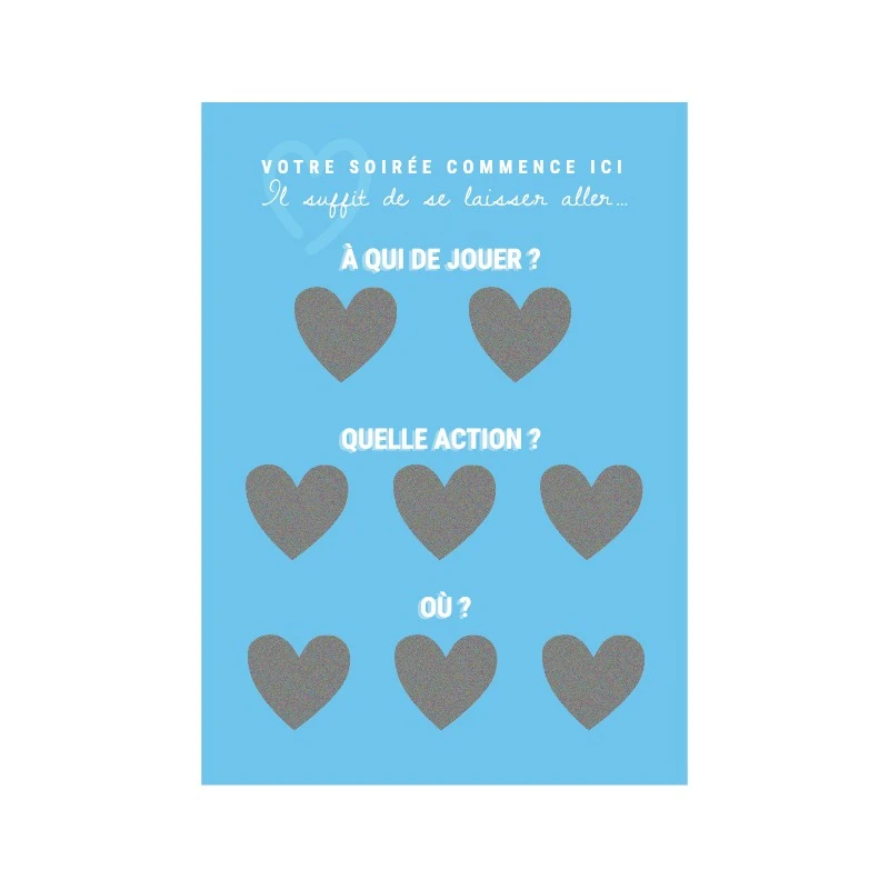 Idéale pour offrir comme cadeau à la Saint Valentin, cette carte à gratter vous promet de passer une soirée sous le signe du hasard ! Destinée à tous les couples, elle se déroule en 3 temps !